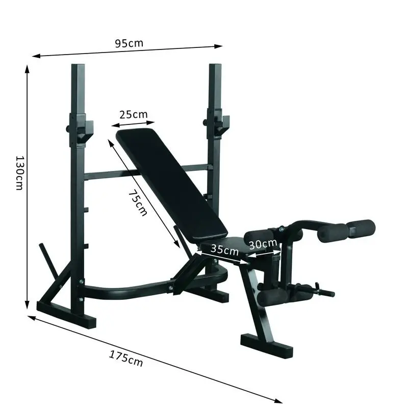 Compra en Decathlon Banco de pesas HOMCOM negro entrenamiento de musculación 175x98x130cm Medida: 175.0×98.0x130.0cm Peso: 28.0 Kg Material: Acero, PVC y goma EVA