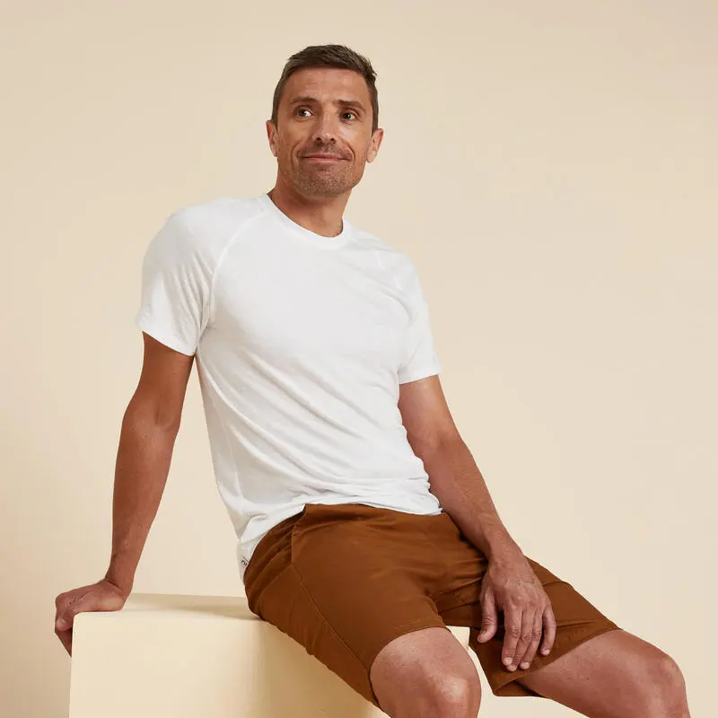Compra en Decathlon Camiseta yoga suave manga corta Hombre Kimjaly Camiseta muy ligera de material natural. Muy suave, extensible y más larga que una camiseta clásica, te olvidarás de ella durante las sesiones de yoga o meditación.