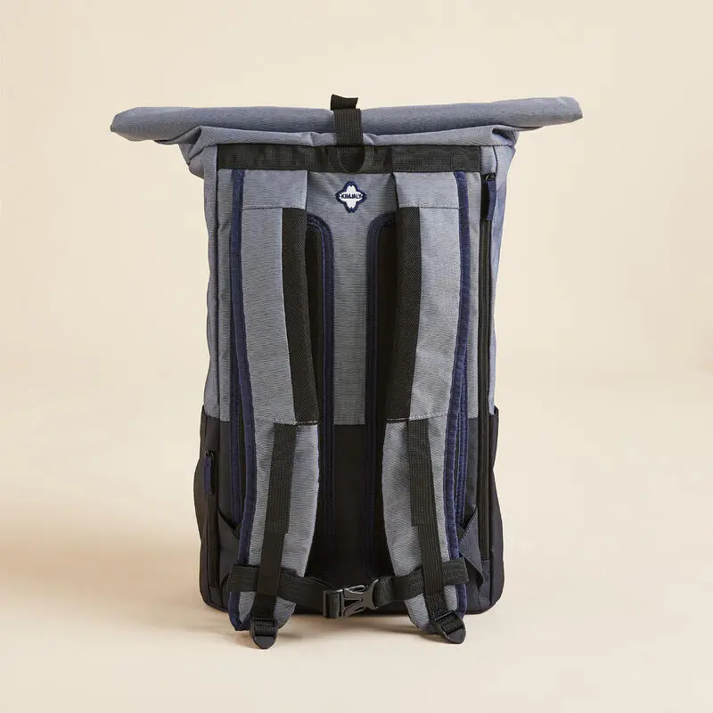 Compra en Decathlon Mochila Esterilla Yoga Azul Gris Nuestros diseñadores yoguis han concebido esta mochila modular muy urbana, para transportar todo el equipo de yoga y el ordenador. Volumen 35 L.