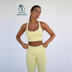 Compra en Decathlon Top deportivo fitness Sostenible poliéster Mujer Fitplanet Coral amarillo Top deportivo sostenible de sujeción alta con copas extraíbles. Tejido muy suave y transpirable para una comodidad máxima. Tejido de secado rápido y permeable al vapor de agua.